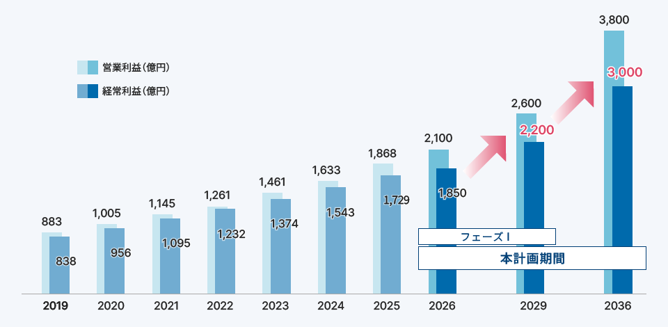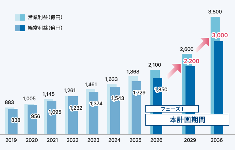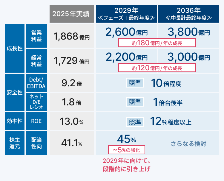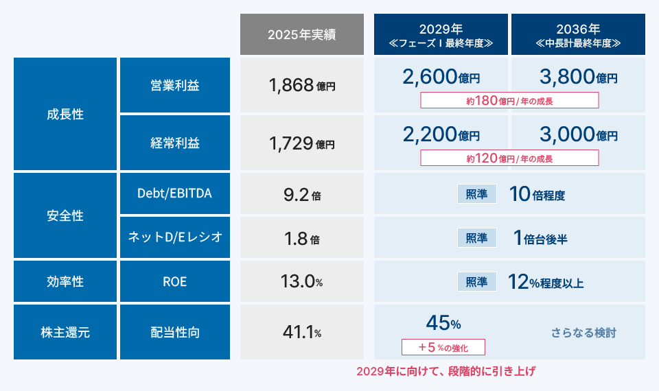 - 最終年度 (2029年) の経常利益目標1,800億円の3年前倒し達成に目途