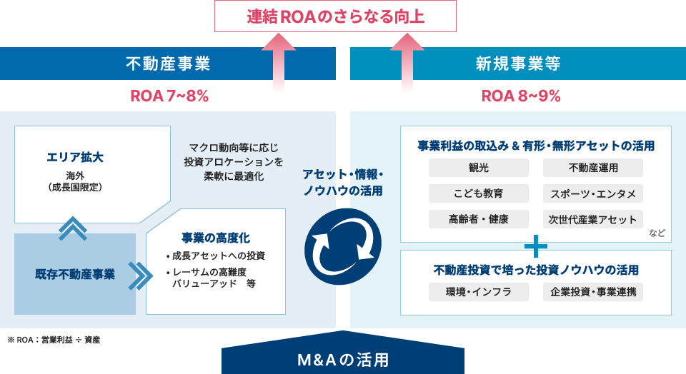 不動産事業をベースとしながらも、多様な事業を取り込むことで利益成長と投資効率化を目指します。