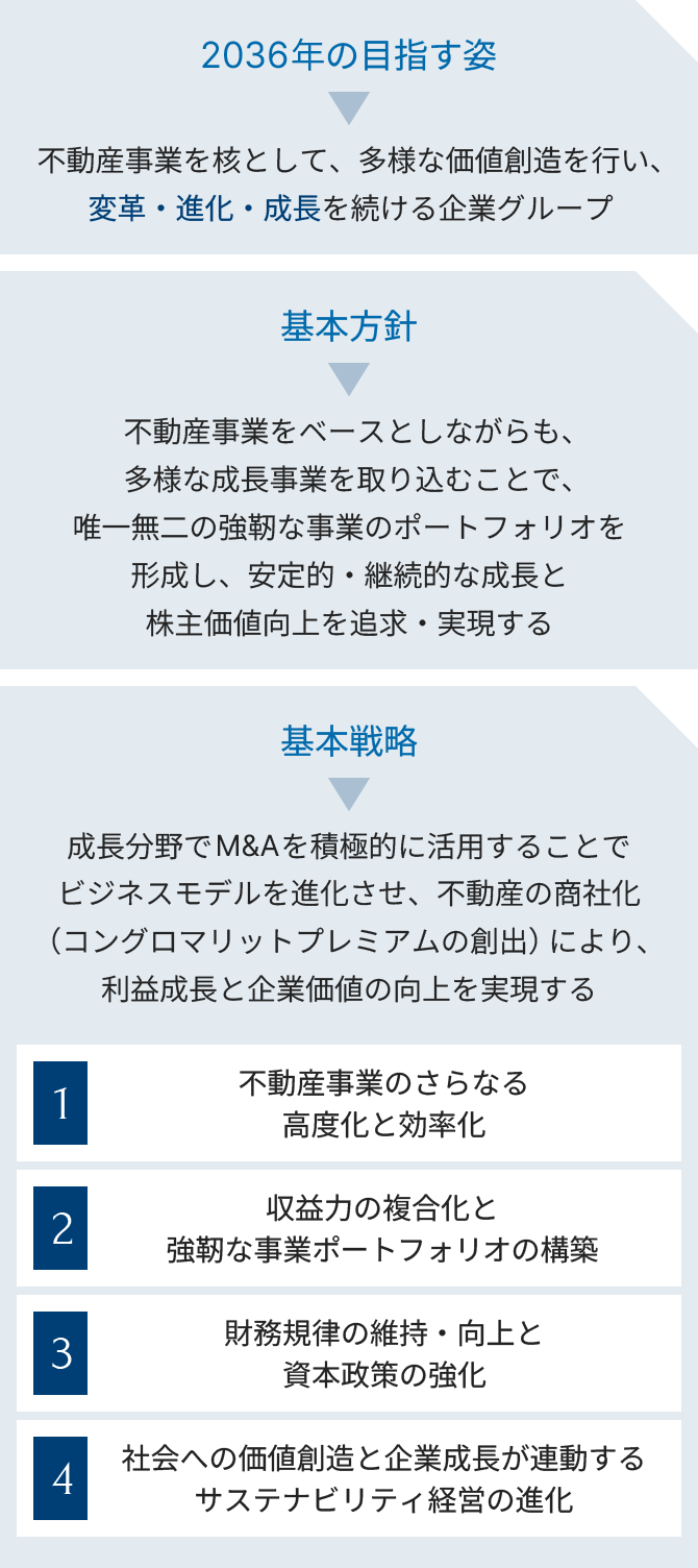 本計画では、不動産事業をベースとしながらも、M&Aを積極的に活用し多様な成長事業を取り込むことで、唯一無二の強靭なポートフォリオを形成し、安定的かつ継続的な成長の実現と、さらなる株主価値向上を目指してまいります。